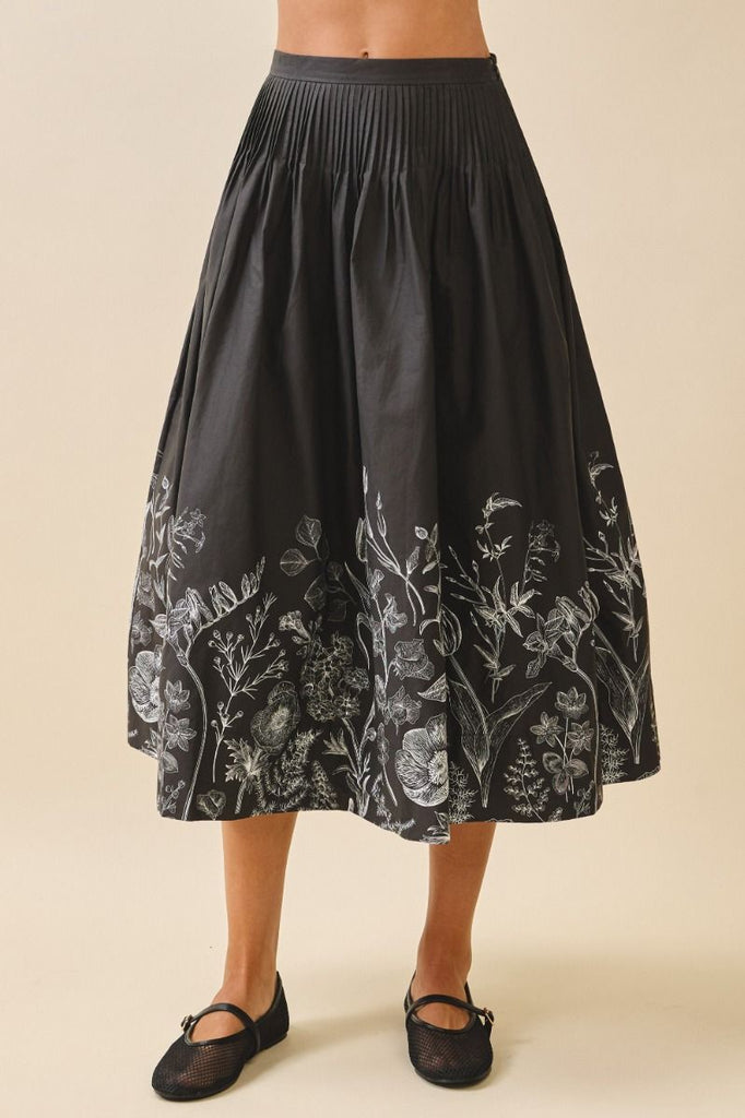 Black midi skirt featuring fine pleats along the waistband and gathered detailing for volume. Designed with an A-line silhouette and intricate white botanical print along the hem for a delicate contrast. Finished with a side zipper closure.