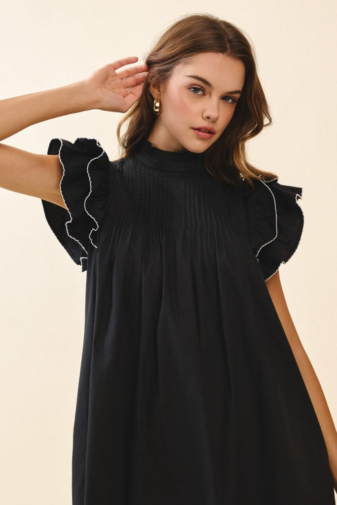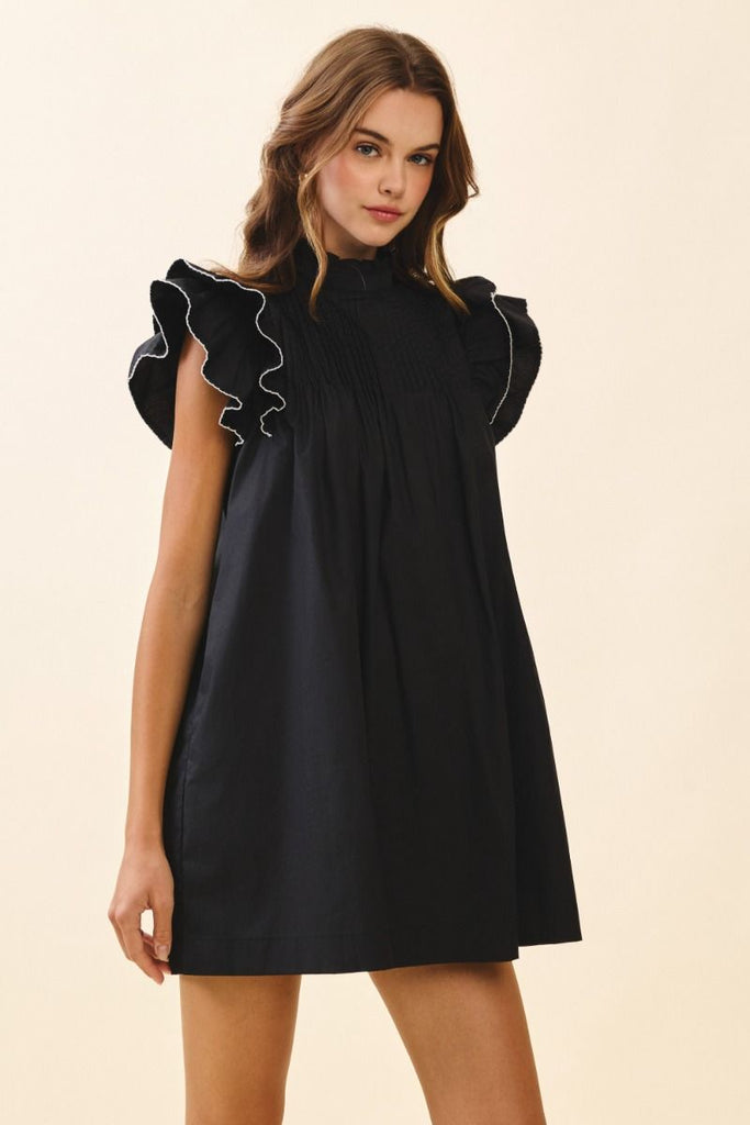 A babydoll mini dress featuring a high neckline with pintuck detailing and ruffled cap sleeves with contrast trim. Designed in a relaxed swing silhouette with side pockets. Finished with a button-down back closure.