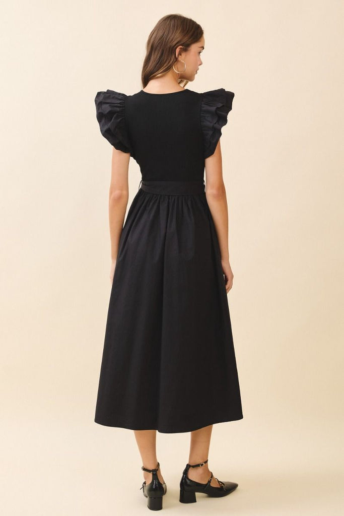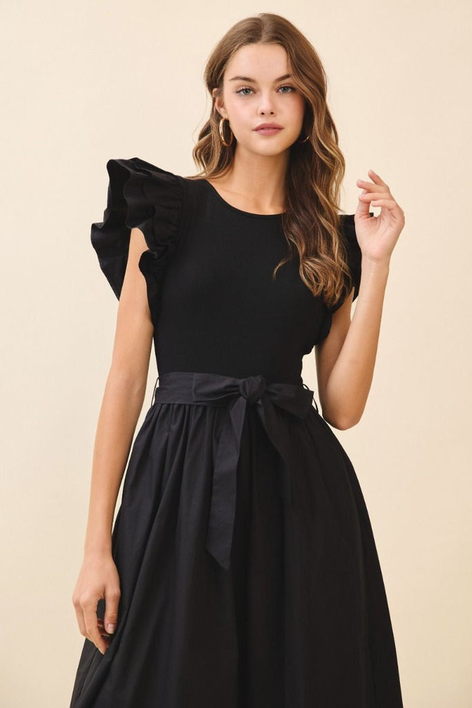 A sleeveless midi dress featuring dramatic double-layered ruffle shoulders. The fitted bodice contrasts with a full A-line skirt cinched at the waist with a wide self-tie sash and side seam pockets.