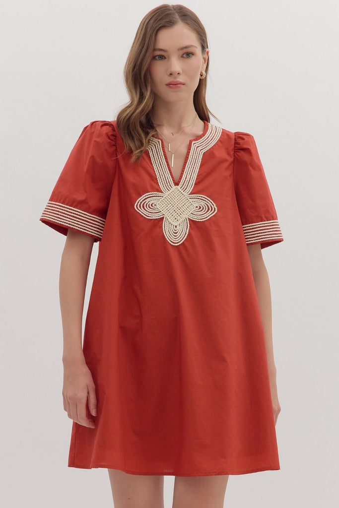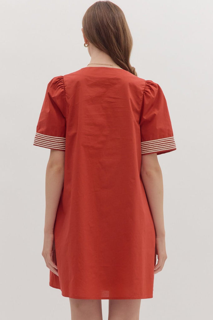 Brick colored mini dress with cream rope detail. It has pockets. 100% cotton.