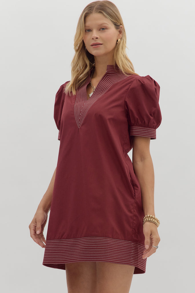 Solid cuff band short puff sleeve pullover mini dress featuring contrast stitch detailed neck band and hem finish. Side pockets. Lined. Woven. Non-sheer. Lightweight.