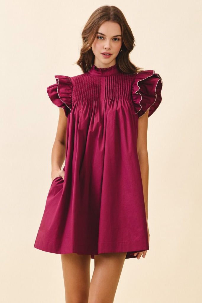 A babydoll mini dress featuring a high neckline with pintuck detailing and ruffled cap sleeves with contrast trim. Designed in a relaxed swing silhouette with side pockets. Finished with a button-down back closure.