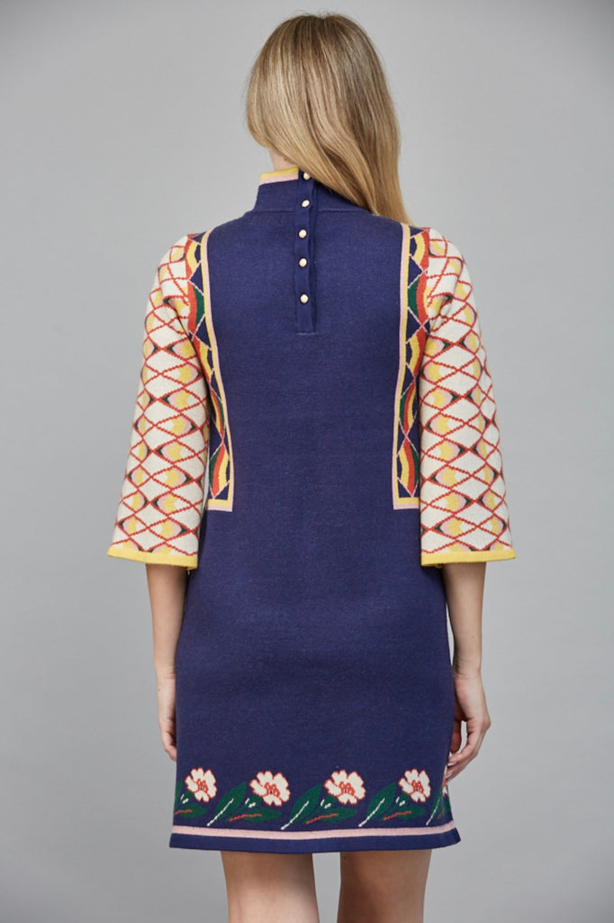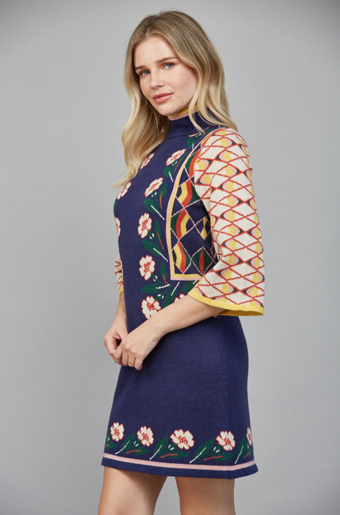 FLORAL AND GEO MOTIF JACQUARD KNIT HIGH NECK SWEATER DRESS