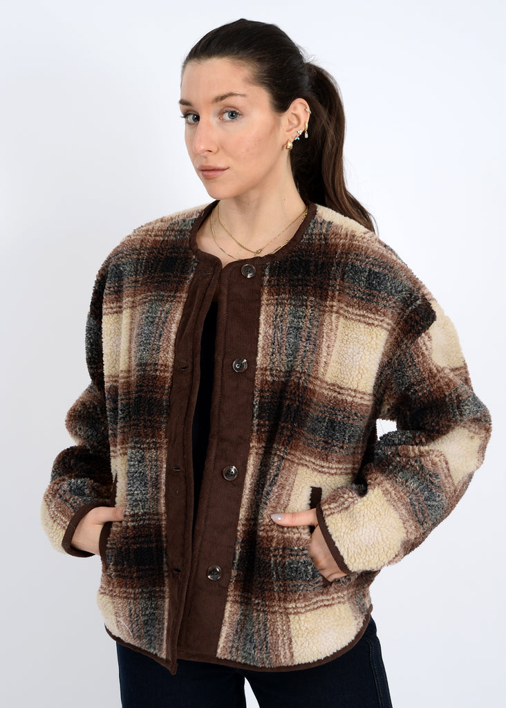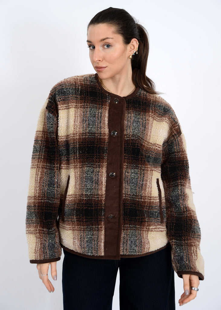 Plaid sherpa jacket with corduroy trim. Button up and it has pockets. Super warm and cozy.