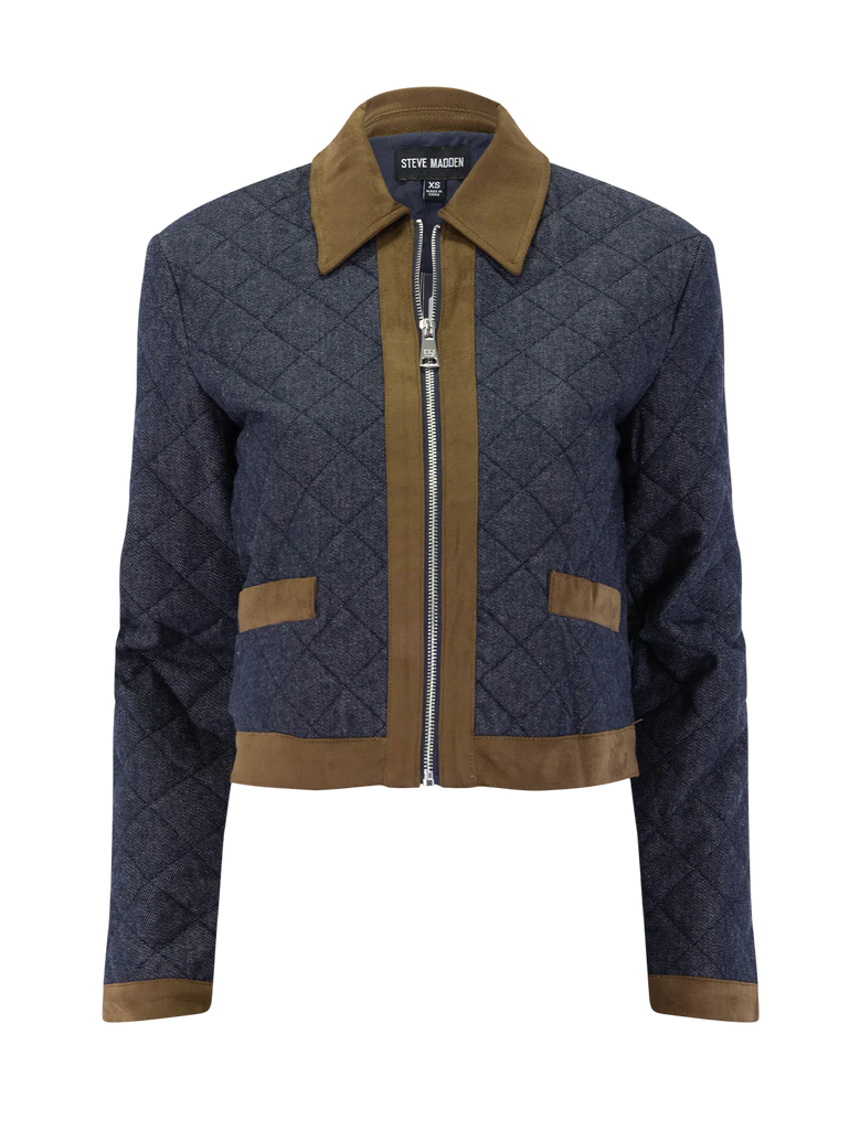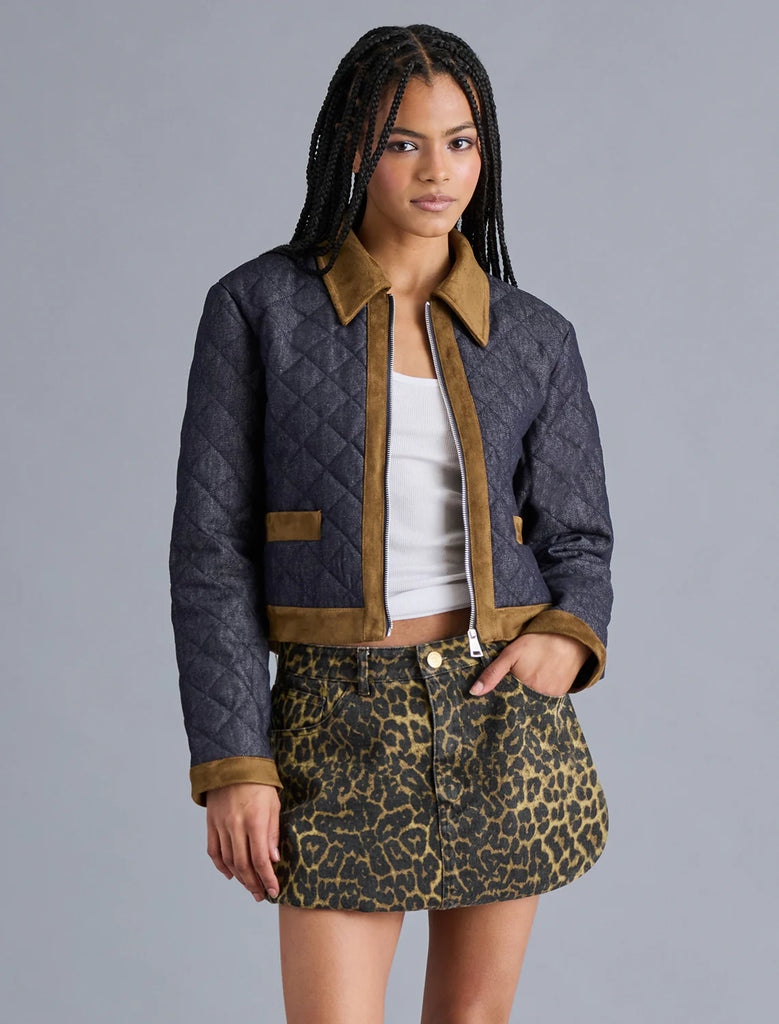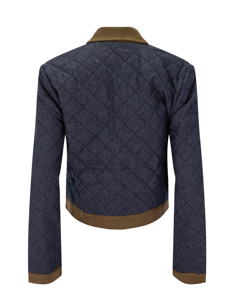 Contrast trim highlights the diamond quilting of this distinguished take on a dark-wash denim jacket.