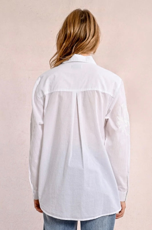 Oversized shirt dotted with tone-on-tone embroidery -Long sleeves, buttoned cuffs -Blouse collar -Button closure along the entire front -Large pleats in the upper back